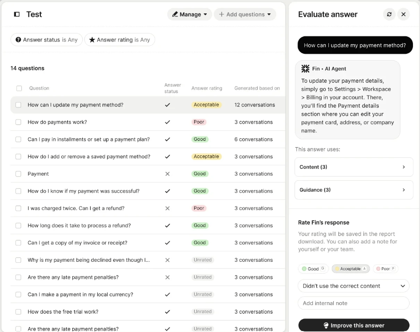Monitor, analyze, and optimize Fin by spotting trends, filling content gaps, and fixing quality issues topic by topic.