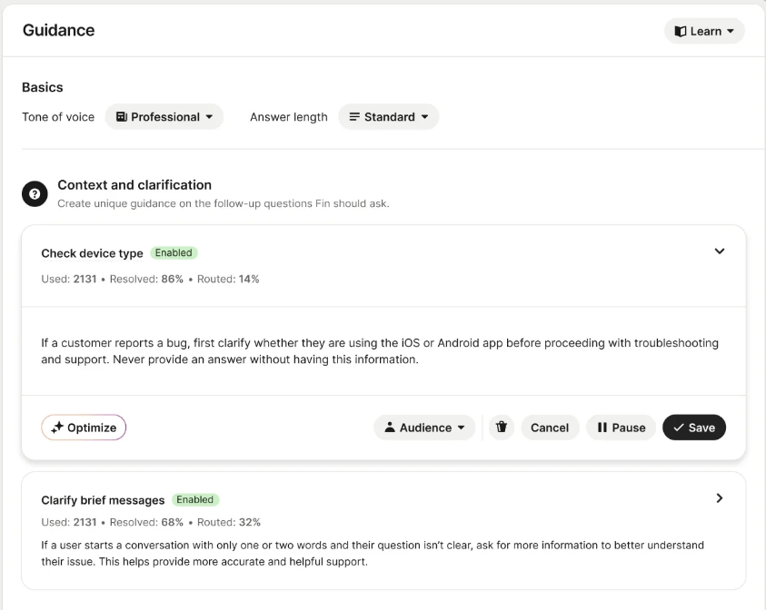 Customize Fin's tone of voice, teach it your support policies, and configure how it handles complex tasks in over 45 languages.