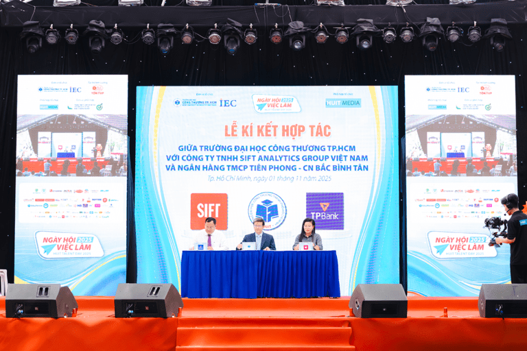 Trong khuôn khổ Ngày hội việc làm – HUIT Talent Day 2025 diễn ra ngày 01/11/2025, SIFT Analytics Group chính thức ký kết thỏa thuận hợp tác với Trường Đại học Công Thương TP. Hồ Chí Minh (HUIT), tiếp tục mở rộng mạng lưới hợp tác đào tạo và phát triển nguồn nhân lực phân tích dữ liệu, AI và tự động hóa tại Việt Nam.